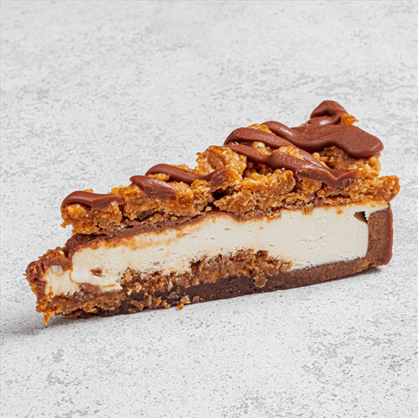 Нежный чизкейк из творожного сыра с начинкой из мягкого кокосового кранча с мякотью кокоса на песочно-шоколадной подложке. Сверху украшен кокосовым кранчем и залит карамелью