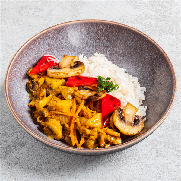 Болгарский перец, шампиньоны, ананас, морковь, лук, пряный карри-соус, рис басмати, кинза.