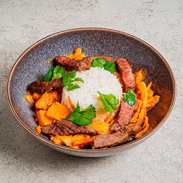 Говядина, ананас, морковь, лук, острый карри-соус, рис басмати, кинза.