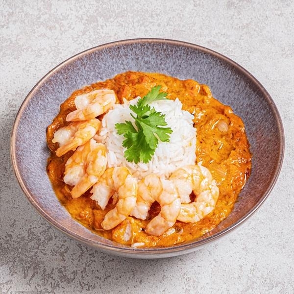 Тигровые креветки, ананас, морковь, лук, острый карри-соус, рис басмати, кинза.