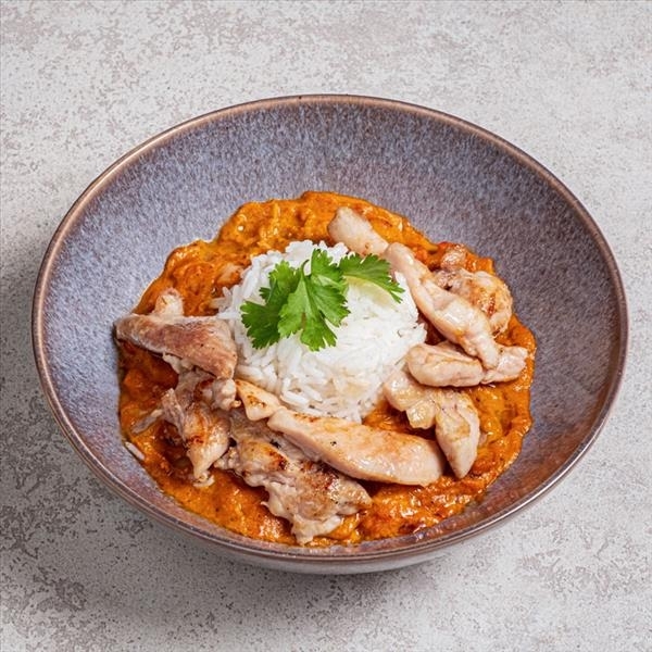 Куриное бедро, ананас, морковь, лук, острый карри-соус, рис басмати, кинза.