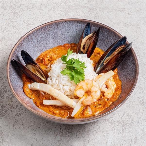 Тигровые креветки, кальмары, мидии в ракушке, ананас, морковь, лук, острый карри-соус, рис басмати, кинза.