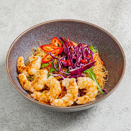 Стеклянная лапша с тигровыми креветками, овощами, руколой, перцем чили и фирменным соусом по рецепту шеф-повара