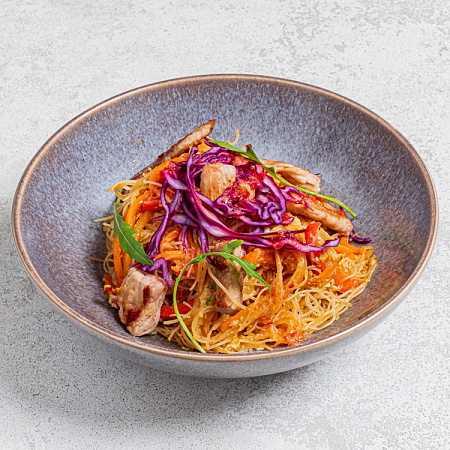 Свиная вырезка, стеклянная лапша, болгарский перец, морковь, капуста, яйцо, рукола, перец чили, красная капуста, фирменный соус по рецепту шеф-повара