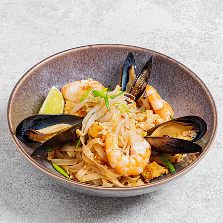 Креветки, кальмар, мидии в створках, рисовая лапша, тофу, яйцо, арахис, зелёный лук, перец чили и фирменный соус по рецепту шеф-повара