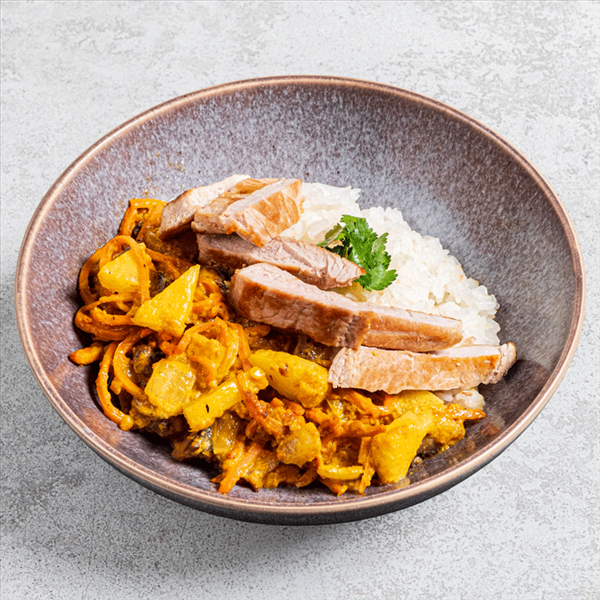 Свиная вырезка, ананас, морковь, лук, пряный карри-соус, рис басмати, кинза.