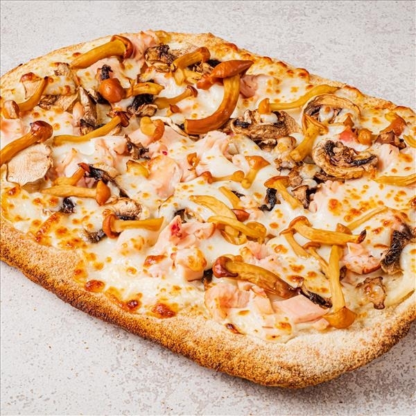 Соус грибной, копчёный цыплёнок, свежие шампиньоны, маринованные опята, сыр моцарелла, тесто