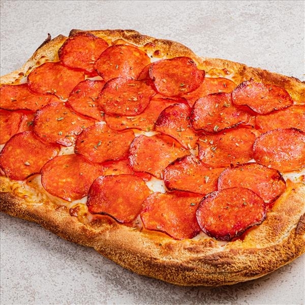 Пицца-соус, пеперони, свежие томаты, сыр моцарелла, специи базилик, тесто