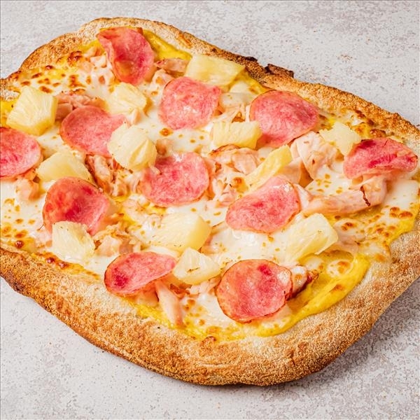 Сырный соус, копчёный цыплёнок, ананасы, свиная ветчина, моцарелла, специи базилик, тесто