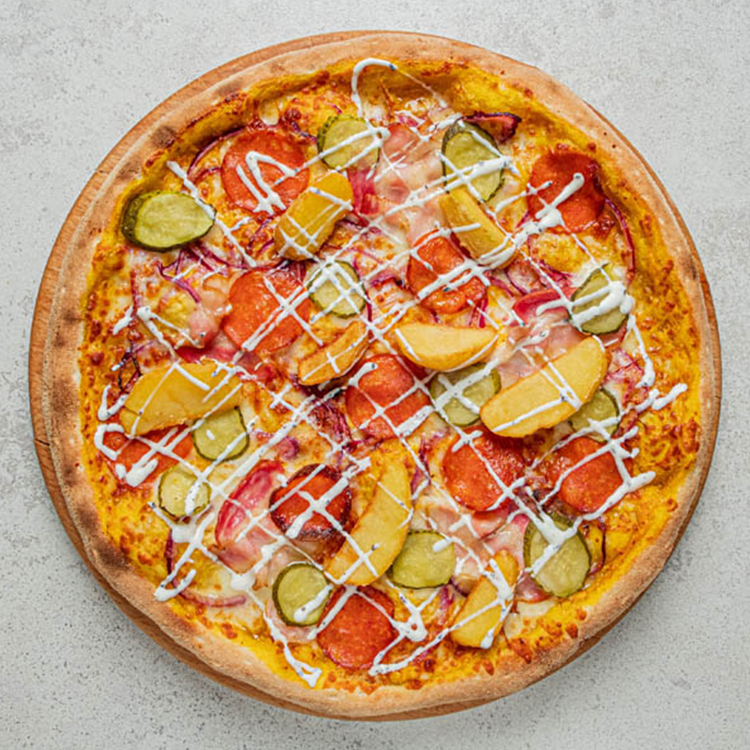 Соус горчичный, соус грибной с чёрным трюфелем, пепперони, красный лук, бекон, огурец маринованный, сыр моцарелла, картофельные дольки, специи базилик, тесто