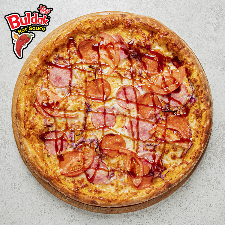 Очень острый соус бульдаг, лук красный, томат, пеперони, ветчина свиная, огурец консервированный, соус терияки, сыр моцарелла, тесто