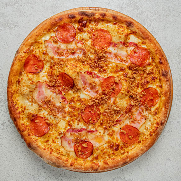 Соус гриль, пеперони, бекон, сыр моцарелла, лук кранч, тесто
