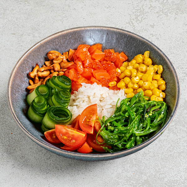 Лосось атлантический, икра лосося, чука-песто и кедровые орехи, огурец, кукуруза, томаты черри, кешью, соус трюфельный васабико, рис.