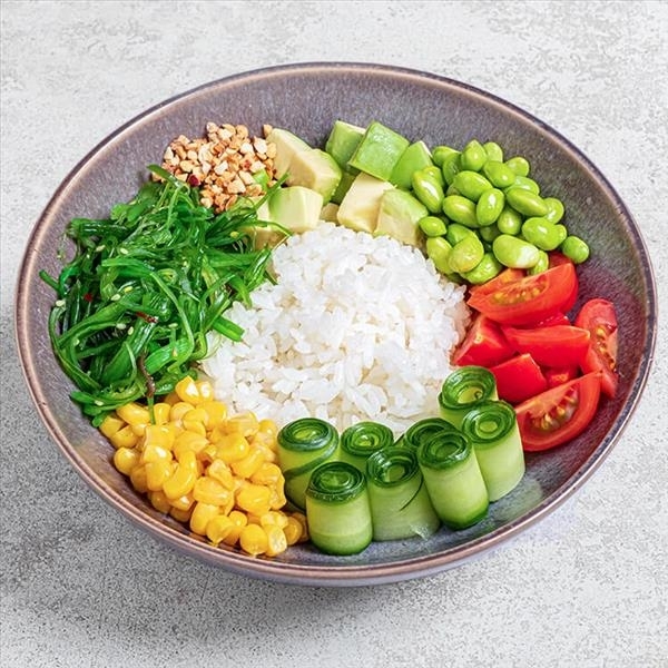 Огурец, чука-песто и кедровые орехи, авокадо, томаты черри, бобы эдамаме, кукуруза, арахис, соус айсберг, рис.