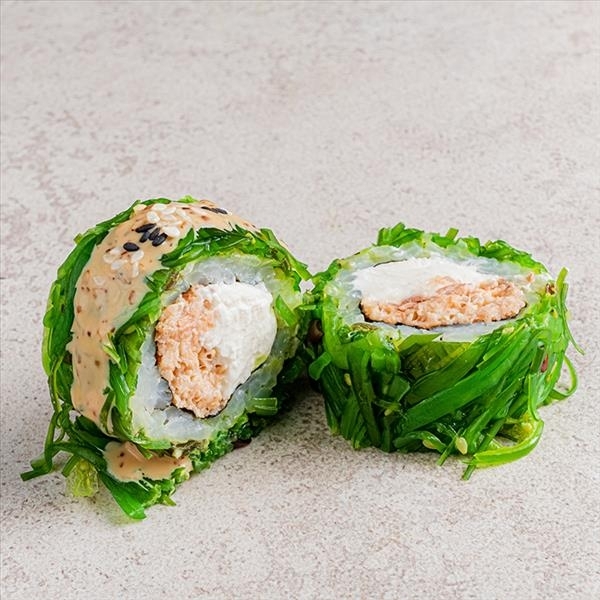 Лосось терияки, творожный сыр, чука-салат, ореховый соус, кунжут, нори, рис (8 шт.)