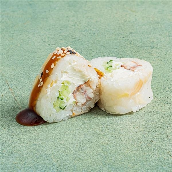 Рисовая бумага, сыр творожный, угорь, огурец, миндаль, соус терияки, кунжут, рис (8 шт.)