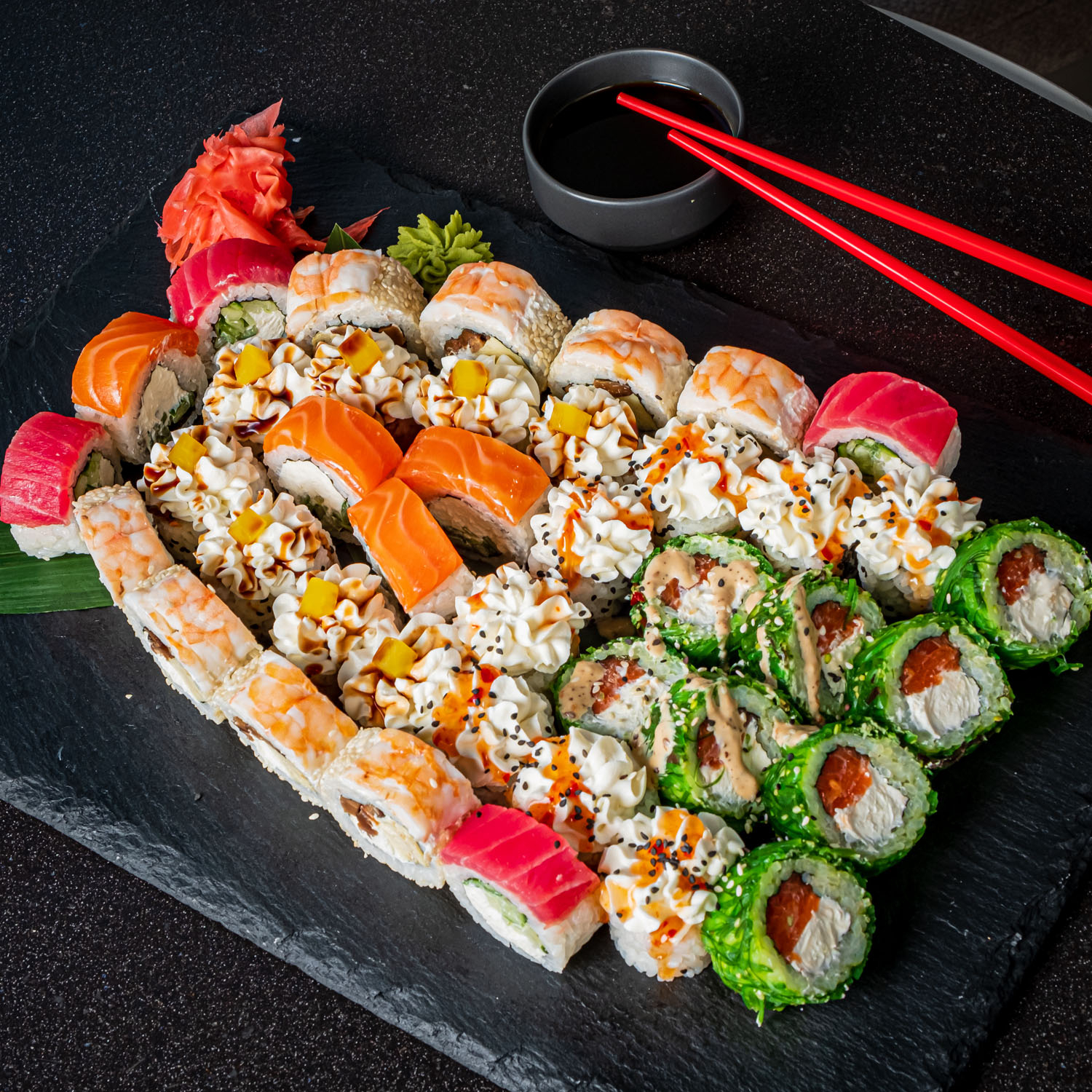 Ролл в кунжуте со сливочным сыром, лососем терияки, огурцом и соусом сладкий чили (8 шт.), ролл в лососе со сливочным сыром и огурцом (4 шт.), ролл в тунце со сливочным сыром и огурцом (4 шт.), ролл в креветке и кунжуте со сливочным сыром, японским омлетом и грибами шиитаке (8 шт.), ролл в кунжуте со сливочным сыром, лососем терияки, огурцом, такуаном и терияки соусом (8 шт.), ролл в чука-салате со сливочным сыром, лососем и кунжутным соусом (8 шт.)