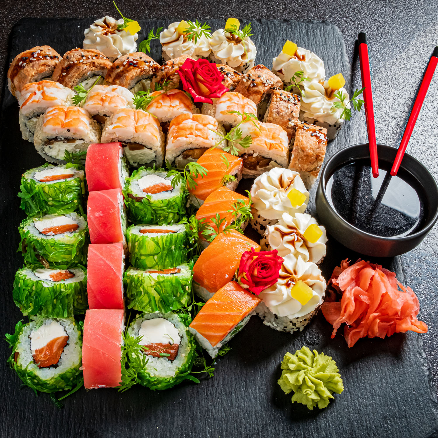 Ролл в лососе терияки со сливочным сыром,японским омлетом, огурцом, кунжутом и соусом терияки (8 шт.), ролл в лососе со сливочным сыром и огурцом (4 шт.), ролл в тунце со сливочным сыром и огурцом (4 шт.), ролл в креветке и кунжуте со сливочным сыром, японским омлетом и грибами шиитаке (8 шт.), ролл в кунжуте со сливочным сыром, лососем терияки, огурцом, такуаном и терияки соусом (8 шт.), ролл в чука-салате со сливочным сыром, лососем и кунжутным соусом (8 шт.)