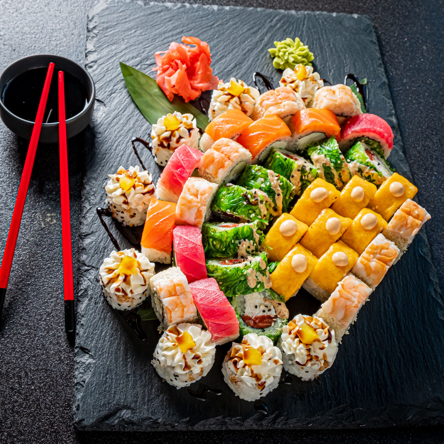 Ролл в сырном замесе со сливочным сыром, копчёной курицей, салатом айсберг и соусом гриль (8 шт.), ролл в лососе со сливочным сыром и огурцом (4 шт.), ролл в тунце со сливочным сыром и огурцом (4 шт.), ролл в креветке и кунжуте со сливочным сыром, японским омлетом и грибами шиитаке (8 шт.), ролл в кунжуте со сливочным сыром, лососем терияки, огурцом, такуаном и терияки соусом (8 шт.), ролл в чука-салате со сливочным сыром, лососем и кунжутным соусом (8 шт.)