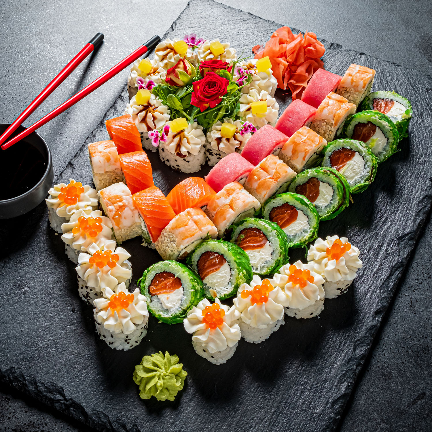 Ролл в кунжуте со сливочным сыром, лососем терики, огурцом и имитированной икрой (8 шт.), ролл в лососе со сливочным сыром и огурцом (4 шт.), ролл в тунце со сливочным сыром и огурцом (4 шт.), ролл в креветке и кунжуте со сливочным сыром, японским омлетом и грибами шиитаке (8 шт.), ролл в кунжуте со сливочным сыром, лососем терияки, огурцом, такуаном и терияки соусом (8 шт.), ролл в чука-салате со сливочным сыром, лососем и кунжутным соусом (8 шт.)