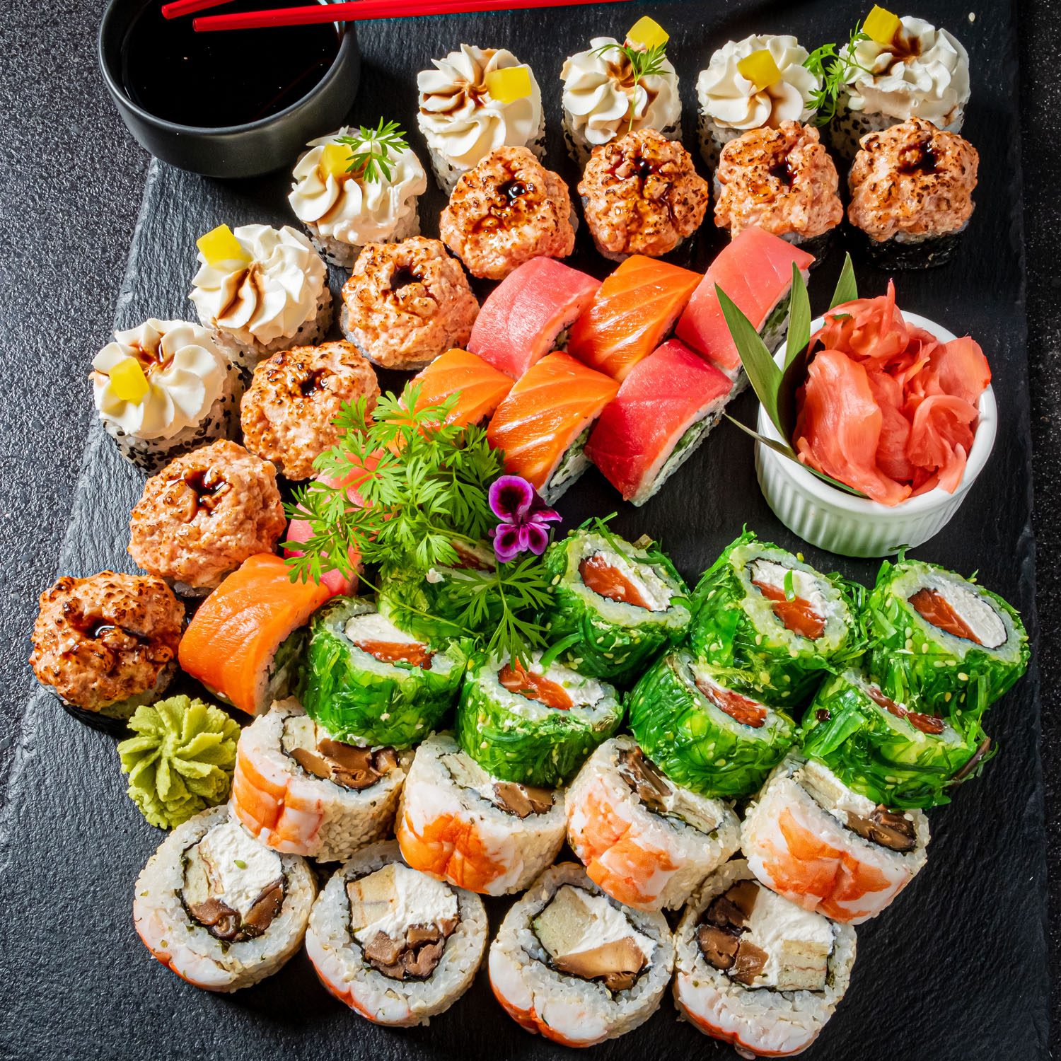 Ролл с опаленным лососем, томатом, огурцом, салатом айсберг и сливочным сыром (8 шт.), ролл в лососе со сливочным сыром и огурцом (4 шт.), ролл в тунце со сливочным сыром и огурцом (4 шт.), ролл в креветке и кунжуте со сливочным сыром, японским омлетом и грибами шиитаке (8 шт.), ролл в кунжуте со сливочным сыром, лососем терияки, огурцом, такуаном и терияки соусом (8 шт.), ролл в чука-салате со сливочным сыром, лососем и кунжутным соусом (8 шт.)
