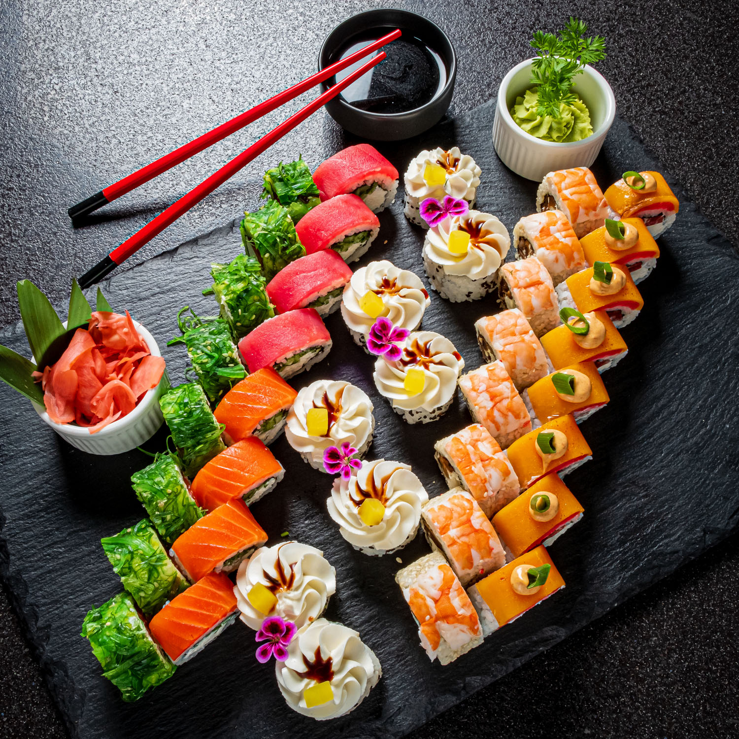 Ролл в спайси-тунце и чеддере со сливочным сыром, сладким перцем, томатами и соусом спайси (8 шт.), ролл в лососе со сливочным сыром и огурцом (4 шт.), ролл в тунце со сливочным сыром и огурцом (4 шт.), ролл в креветке и кунжуте со сливочным сыром, японским омлетом и грибами шиитаке (8 шт.), ролл в кунжуте со сливочным сыром, лососем терияки, огурцом, такуаном и терияки соусом (8 шт.), ролл в чука-салате со сливочным сыром, лососем и кунжутным соусом (8 шт.)