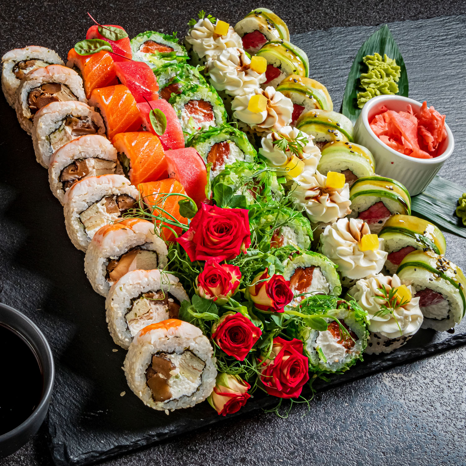 Ролл в огурце со сливочным сыром, тунцом и соусом терияки (8 шт.), ролл в лососе со сливочным сыром и огурцом (4 шт.), ролл в тунце со сливочным сыром и огурцом (4 шт.), ролл в креветке и кунжуте со сливочным сыром, японским омлетом и грибами шиитаке (8 шт.), ролл в кунжуте со сливочным сыром, лососем терияки, огурцом, такуаном и терияки соусом (8 шт.), ролл в чука-салате со сливочным сыром, лососем и кунжутным соусом (8 шт.)