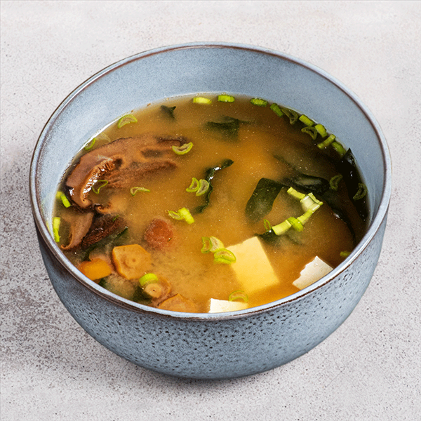 Водоросли вакаме, грибы намеко, грибы шиитаке, тофу, соевая мисо-паста, зелёный лук.
